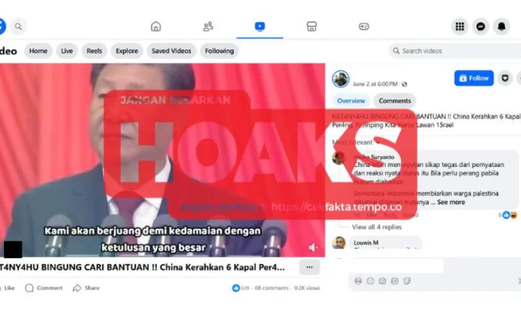 Mimbartimur.com – Sebuah konten yang beredar di Facebook pada 2 Juni 2025 mengklaim bahwa Cina telah mengerahkan enam kapal perang ke Timur Tengah sebagai tindakan balasan setelah seorang diplomatnya ditembak oleh pasukan Israel. Video tersebut menampilkan Presiden Cina Xi Jinping, Menteri Luar Negeri Mao Ning, serta kolase gambar kapal perang dan tentara Israel.
