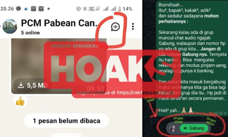 Dua pesan berantai yang diterima oleh Tempo berisi peringatan bagi pengguna internet untuk menghindari ajakan bergabung dalam grup WhatsApp yang menawarkan fitur chat suara. Fitur ini ditandai dengan lingkaran yang memiliki tiga garis vertikal, terletak di sebelah kanan layar aplikasi WhatsApp.