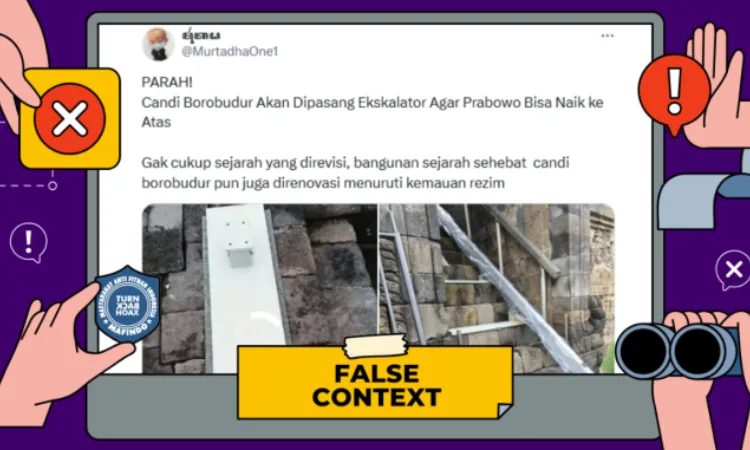 Unggahan video yang mengklaim “Candi Borobudur akan dipasang eskalator agar Prabowo bisa naik ke atas” merupakan konteks yang salah (false context). ***