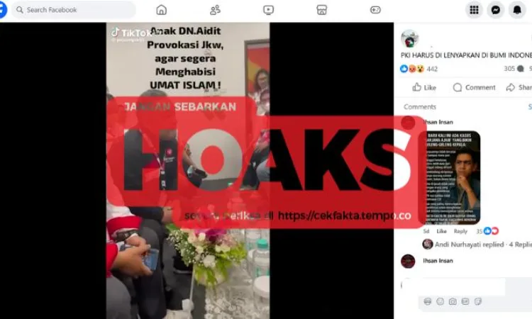 Mimbartimur.com – Sebuah akun di Facebook [arsip] mengklaim bahwa anak Dipa Nusantara Aidit sedang memprovokasi Presiden RI ke-7, Jokowi, untuk menyerang umat Muslim. Dipa Nusantara Aidit (DN Aidit) merupakan Sekretaris Jenderal Partai Komunis Indonesia (PKI) dari tahun 1951 hingga 1965.