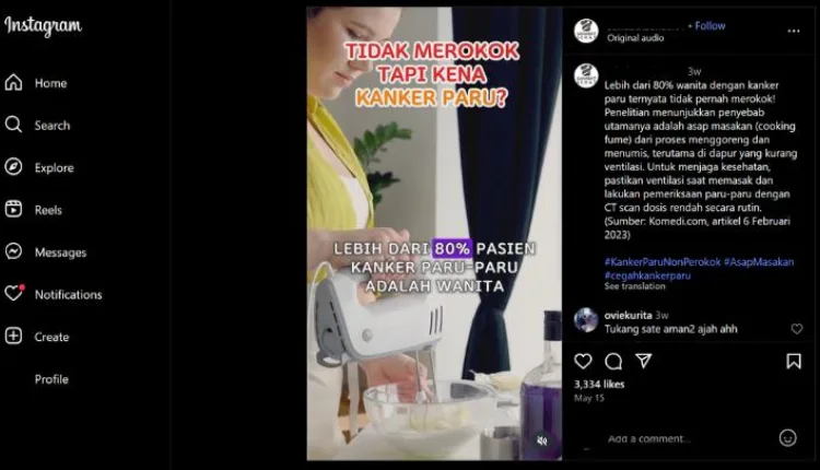 Mimbartimur.com – Sebuah akun di media sosial Instagram baru-baru ini mengunggah video yang membahas mengenai kanker paru-paru pada perempuan. Dalam video tersebut, disampaikan informasi bahwa lebih dari 80% wanita yang menderita kanker paru-paru ternyata tidak pernah merokok.
