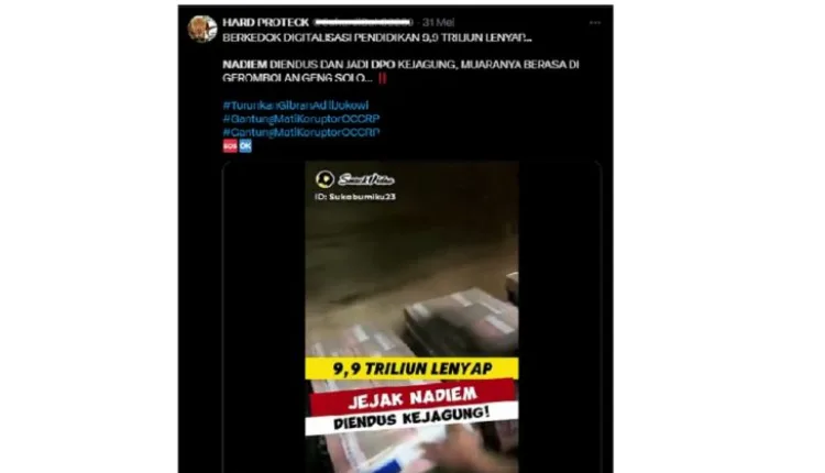 Dalam narasi video tersebut, dinyatakan, “BERKEDOK DIGITALISASI PENDIDIKAN 9,9 TRILIUN LENYAP… NADIEM DIENDUS DAN MENJADI DPO KEJAGUNG, MUARANYA BERASA DI GEROMBOLAN GENG SOLO…!!”