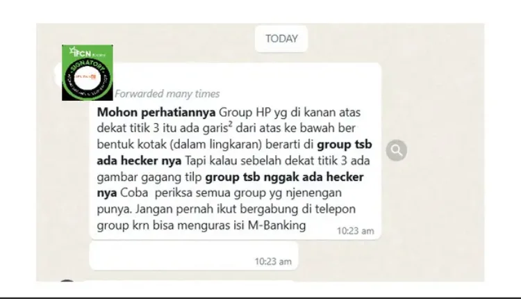 “Mohon perhatiannya, di grup HP yang terletak di kanan atas dekat titik tiga, terdapat garis-garis dari atas ke bawah berbentuk kotak (dalam lingkaran), yang menunjukkan adanya hacker di grup tersebut. Namun, jika di dekat titik tiga terdapat gambar gagang telepon, itu berarti grup tersebut tidak memiliki hacker. Silakan periksa semua grup yang Anda miliki. Jangan pernah bergabung dalam panggilan grup, karena dapat menguras isi M-Banking.”