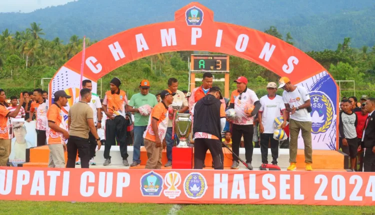Mimbartimur.com Pemerintah Kabupaten Halmahera Selatan (Halsel) melalui Dinas Pemuda dan Olahraga (Dispora) Halsel menyerahkan bantuan peralatan olahraga. Penyerahan berlangsung di Lapangan GBK Halsel, bertepatan dengan penutupan turnamen Bupati Cup 2024.