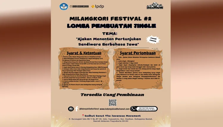 Mimbartimur.com – Lomba Jingle Sandiwara Berbahasa Jawa diadakan Kelompok Sedhut Senut dalam rangkaian MILANGKORI Festival #2, bagian program dukungan dari Dana Indonesiana Kementrian Kebudayaan RI. Lomba Jingle ini dibuka untuk umum, pendaftaran gratis.