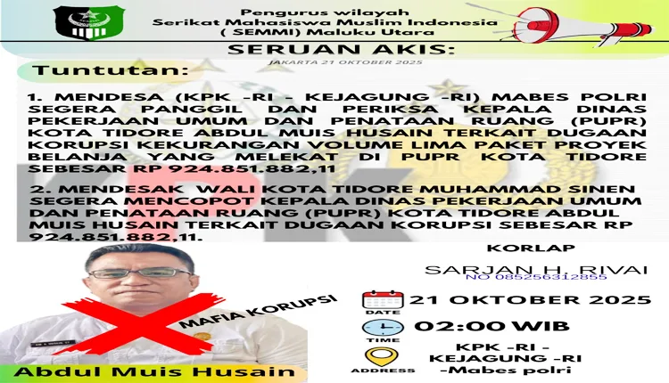 Mimbartimurcom – Pengurus Wilayah Serikat Mahasiswa Muslim Indonesia (SEMMI) Maluku Utara bakal menggelar demonstrasi di gedung Komisi Pemberantasan Korupsi (KPK) pada Senin, (21/10) mendatang. Aksi tersebut terkait dugaan korupsi yang melibatkan Kepala Dinas Pekerjaan Umum dan Penataan Ruang (PUPR) Abdul Muis Husain.